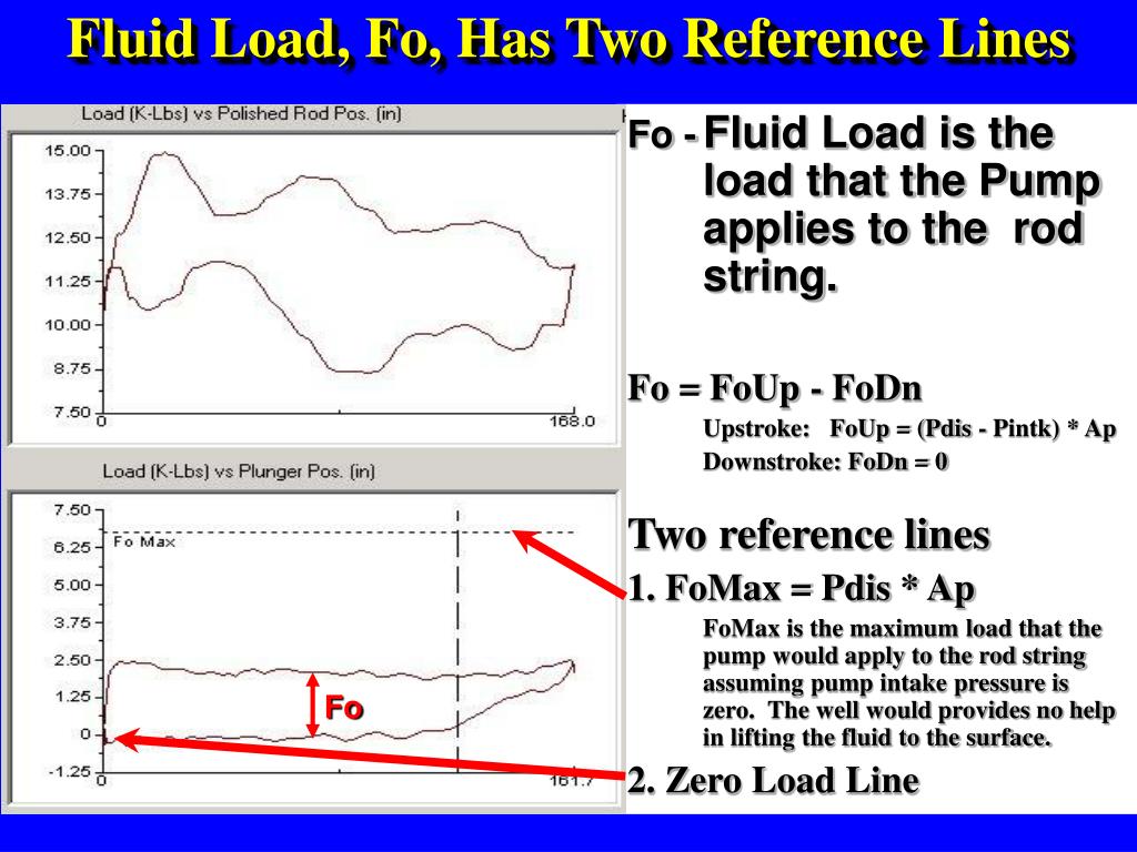 Fluid Load, Fo, Has Two Reference Lines Fo - Fluid Load is the load that the Pump applies to the rod string. Fo = FoUp - FoDn Upstroke: FoUp = (Pdis - Pintk) * Ap Downstroke: FoDn = 0 Two reference lines 1. FoMax = Pdis * Ap FoMax is the maximum load that the pump would apply to the rod string assuming pump intake pressure is zero. The well would provides no help in lifting the fluid to the surface. 2. Zero Load Line Fo