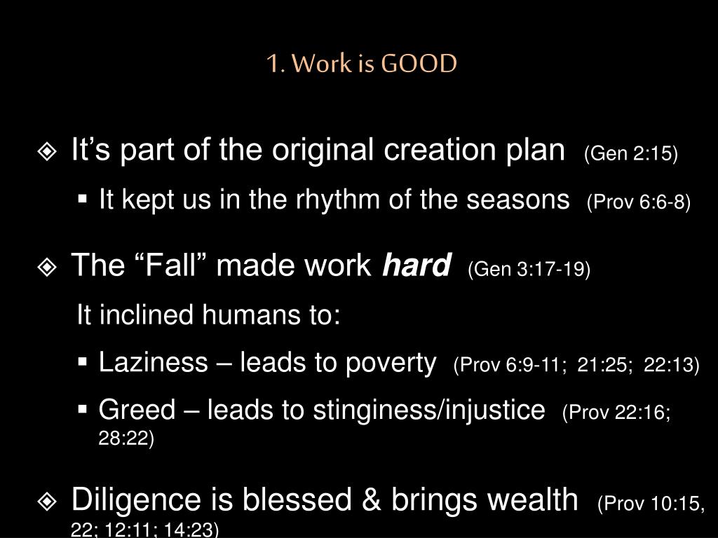1. Work is GOOD • It’s part of the original creation plan (Gen 2:15) • It kept us in the rhythm of the seasons (Prov 6:6-8) • The “Fall” made work hard(Gen 3:17-19) It inclined humans to: • Laziness – leads to poverty (Prov 6:9-11; 21:25; 22:13) • Greed – leads to stinginess/injustice (Prov 22:16; 28:22) • Diligence is blessed & brings wealth (Prov 10:15, 22; 12:11; 14:23)
