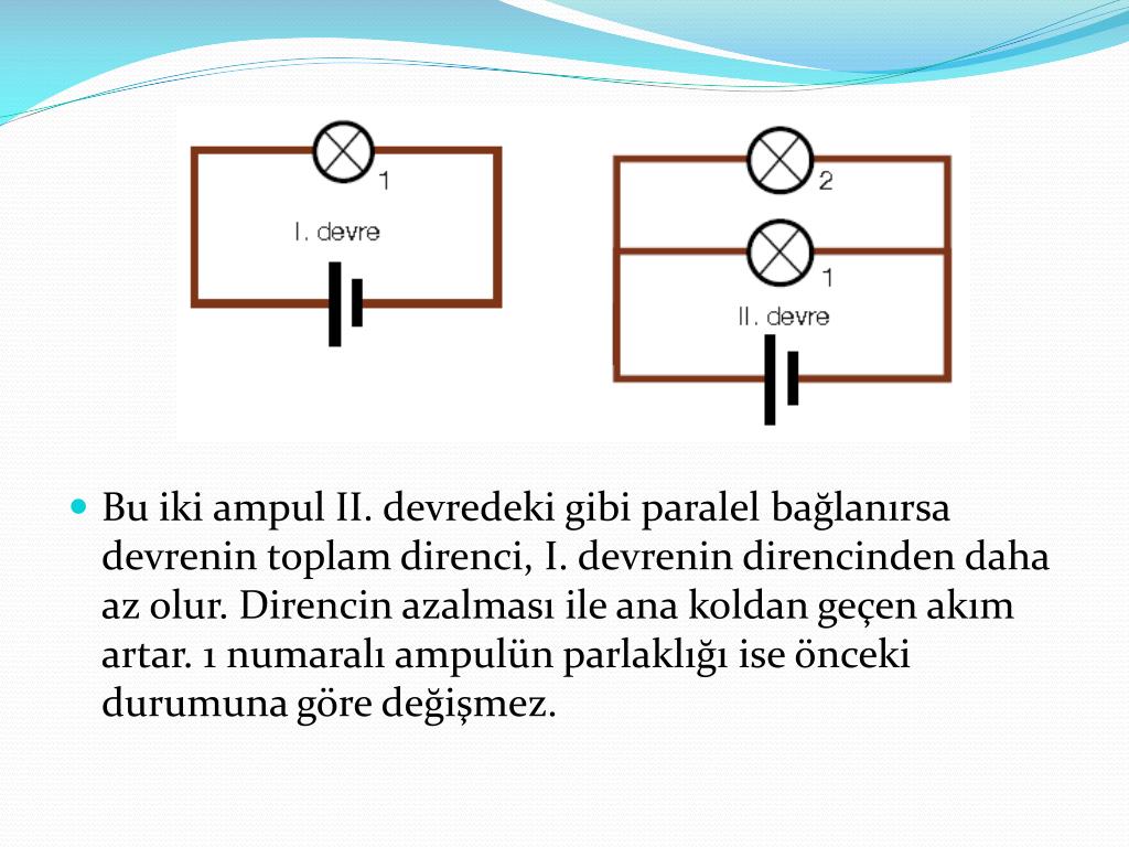 Bu iki ampul II. devredeki gibi paralel bağlanırsa devrenin toplam direnci, I. devrenin direncinden daha az olur. Direncin azalması ile ana koldan geçen akım artar. 1 numaralı ampulün parlaklığı ise önceki durumuna göre değişmez.