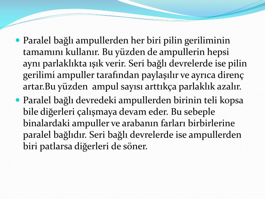 Paralel bağlı ampullerden her biri pilin geriliminin tamamını kullanır. Bu yüzden de ampullerin hepsi aynı parlaklıkta ışık verir. Seri bağlı devrelerde ise pilin gerilimi ampuller tarafından paylaşılır ve ayrıca direnç artar.Bu yüzden ampul sayısı arttıkça parlaklık azalır. • Paralel bağlı devredeki ampullerden birinin teli kopsa bile diğerleri çalışmaya devam eder. Bu sebeple binalardaki ampuller ve arabanın farları birbirlerine paralel bağlıdır. Seri bağlı devrelerde ise ampullerden biri patlarsa diğerleri de söner.