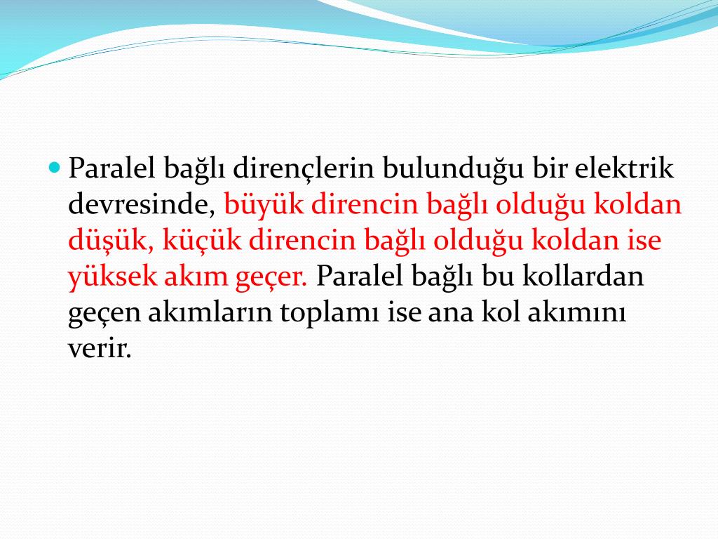 Paralel bağlı dirençlerin bulunduğu bir elektrik devresinde, büyük direncin bağlı olduğu koldan düşük, küçük direncin bağlı olduğu koldan ise yüksek akım geçer. Paralel bağlı bu kollardan geçen akımların toplamı ise ana kol akımını verir.