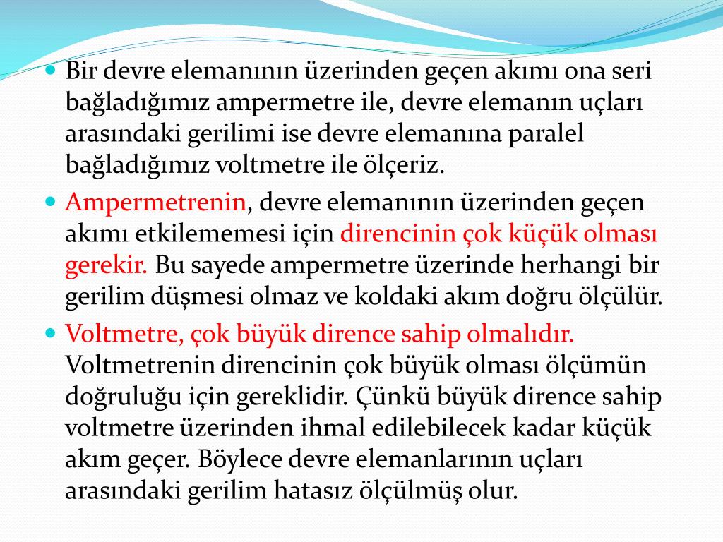 Bir devre elemanının üzerinden geçen akımı ona seri bağladığımız ampermetre ile, devre elemanın uçları arasındaki gerilimi ise devre elemanına paralel bağladığımız voltmetre ile ölçeriz. • Ampermetrenin, devre elemanının üzerinden geçen akımı etkilememesi için direncinin çok küçük olması gerekir. Bu sayede ampermetre üzerinde herhangi bir gerilim düşmesi olmaz ve koldaki akım doğru ölçülür. • Voltmetre, çok büyük dirence sahip olmalıdır. Voltmetrenin direncinin çok büyük olması ölçümün doğruluğu için gereklidir. Çünkü büyük dirence sahip voltmetre üzerinden ihmal edilebilecek kadar küçük akım geçer. Böylece devre elemanlarının uçları arasındaki gerilim hatasız ölçülmüş olur.