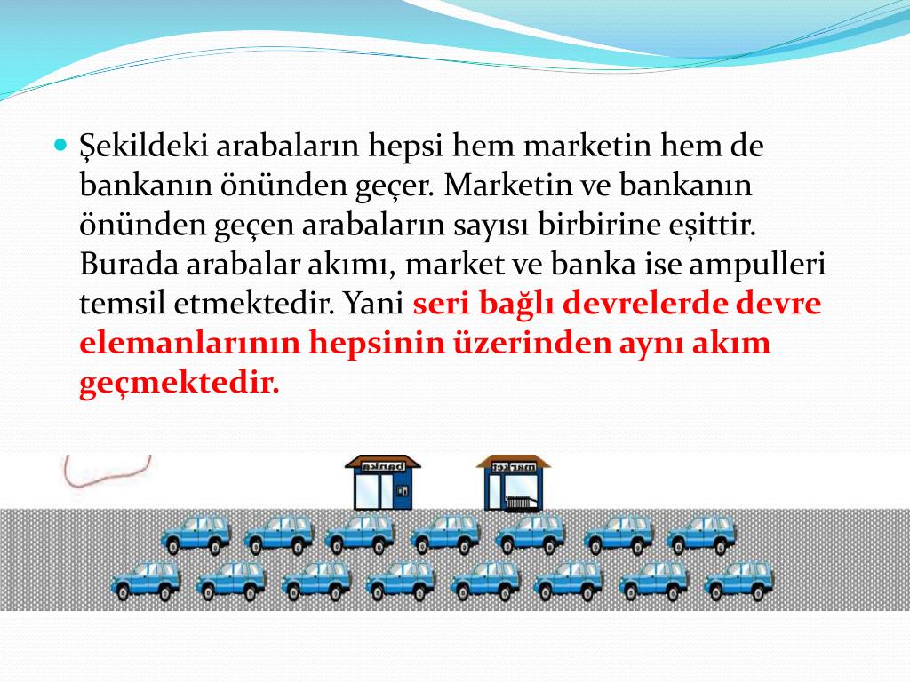 Şekildeki arabaların hepsi hem marketin hem de bankanın önünden geçer. Marketin ve bankanın önünden geçen arabaların sayısı birbirine eşittir. Burada arabalar akımı, market ve banka ise ampulleri temsil etmektedir. Yani seri bağlı devrelerde devre elemanlarının hepsinin üzerinden aynı akım geçmektedir.