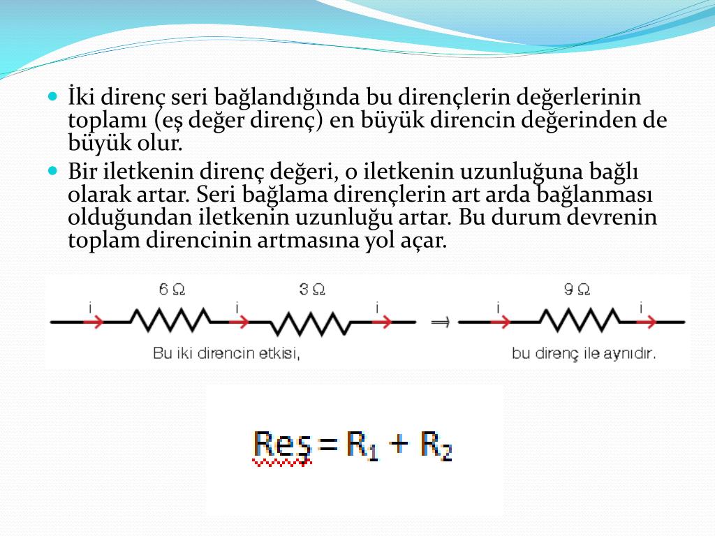 İki direnç seri bağlandığında bu dirençlerin değerlerinin toplamı (eş değer direnç) en büyük direncin değerinden de büyük olur. • Bir iletkenin direnç değeri, o iletkenin uzunluğuna bağlı olarak artar. Seri bağlama dirençlerin art arda bağlanması olduğundan iletkenin uzunluğu artar. Bu durum devrenin toplam direncinin artmasına yol açar.