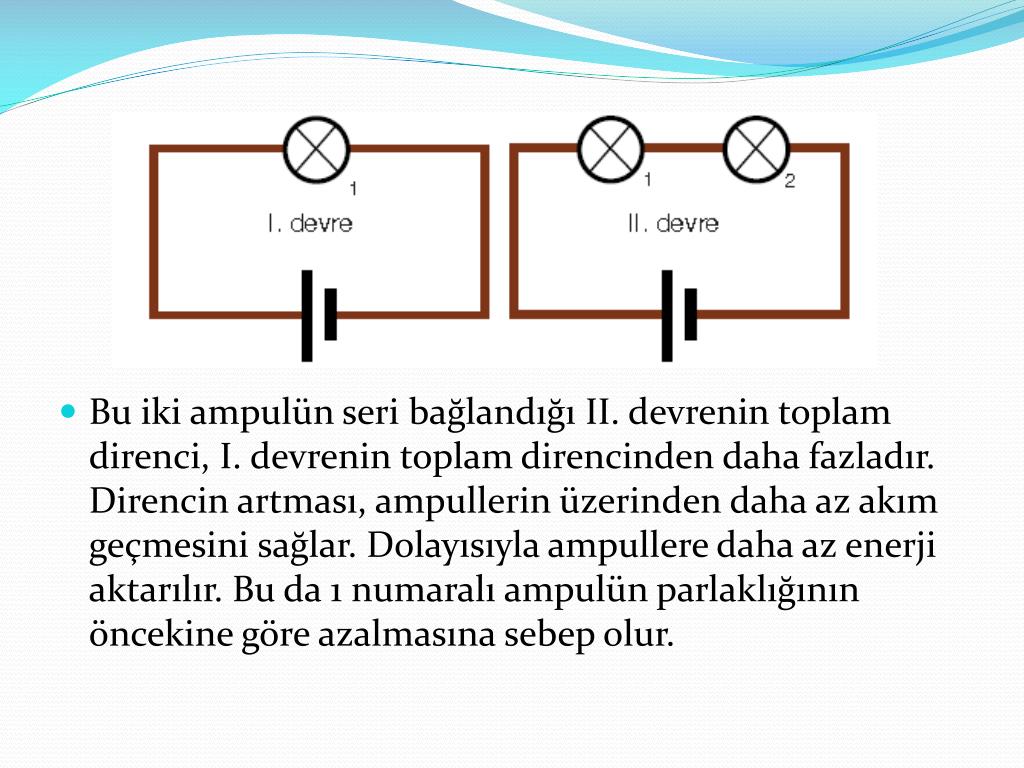 Bu iki ampulün seri bağlandığı II. devrenin toplam direnci, I. devrenin toplam direncinden daha fazladır. Direncin artması, ampullerin üzerinden daha az akım geçmesini sağlar. Dolayısıyla ampullere daha az enerji aktarılır. Bu da 1 numaralı ampulün parlaklığının öncekine göre azalmasına sebep olur.