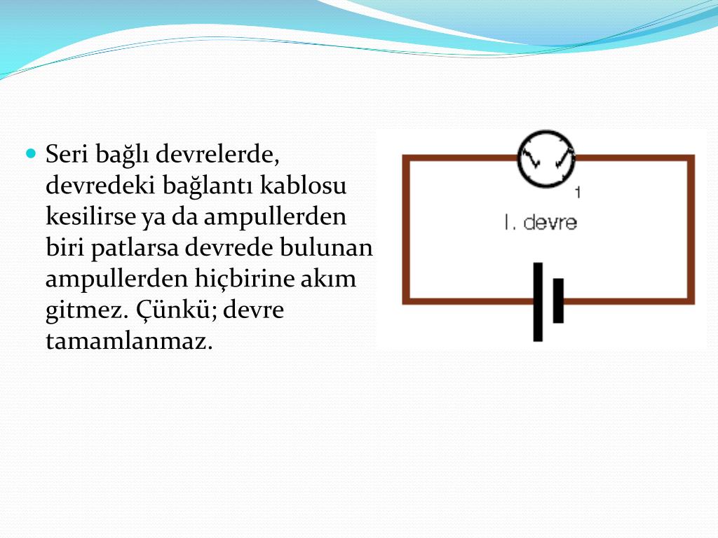 Seri bağlı devrelerde, devredeki bağlantı kablosu kesilirse ya da ampullerden biri patlarsa devrede bulunan ampullerden hiçbirine akım gitmez. Çünkü; devre tamamlanmaz.