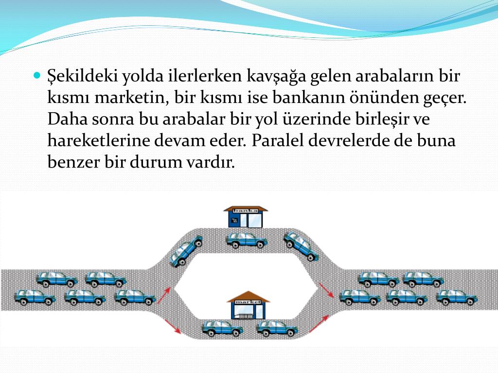 Şekildeki yolda ilerlerken kavşağa gelen arabaların bir kısmı marketin, bir kısmı ise bankanın önünden geçer. Daha sonra bu arabalar bir yol üzerinde birleşir ve hareketlerine devam eder. Paralel devrelerde de buna benzer bir durum vardır.