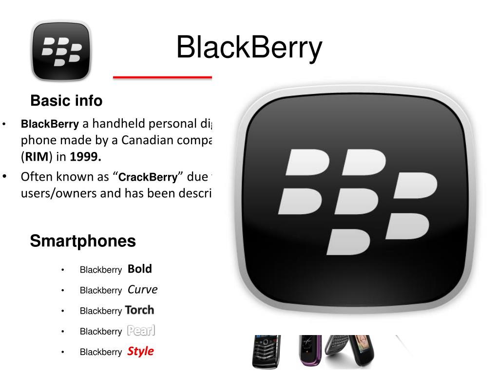BlackBerry Basic info Smartphones Blackberry Bold Blackberry Curve Blackberry Torch Blackberry Pearl Blackberry Style • BlackBerry a handheld personal digital assistant and mobile phone made by a Canadian company Research in Motion (RIM) in 1999. • Often known as “CrackBerry” due to the excessive use by it’s users/owners and has been described as “addictive”.