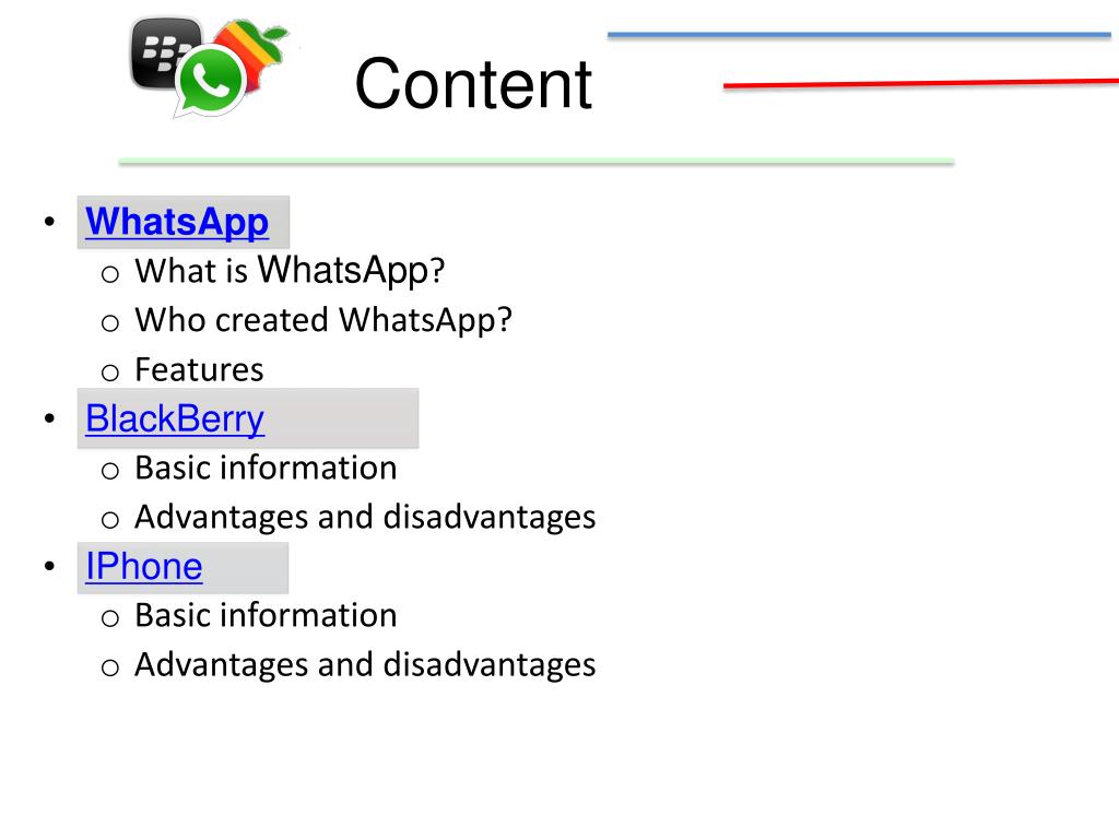 Content • WhatsApp • What is WhatsApp? • Who created WhatsApp? • Features • BlackBerry • Basic information • Advantages and disadvantages • IPhone • Basic information • Advantages and disadvantages