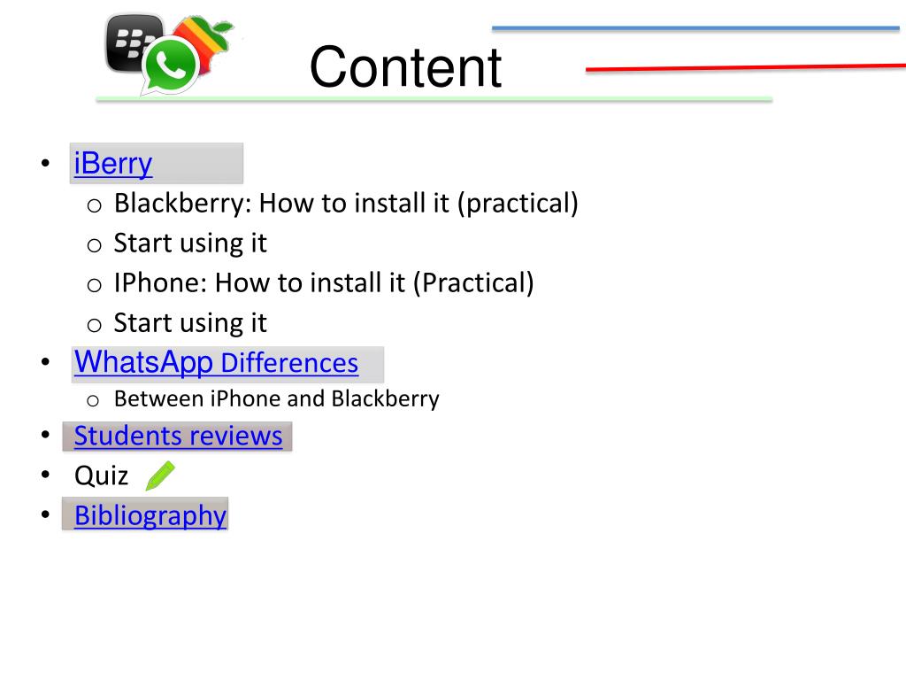 Content • iBerry • Blackberry: How to install it (practical) • Start using it • IPhone: How to install it (Practical) • Start using it • WhatsApp Differences • Between iPhone and Blackberry • Students reviews • Quiz • Bibliography
