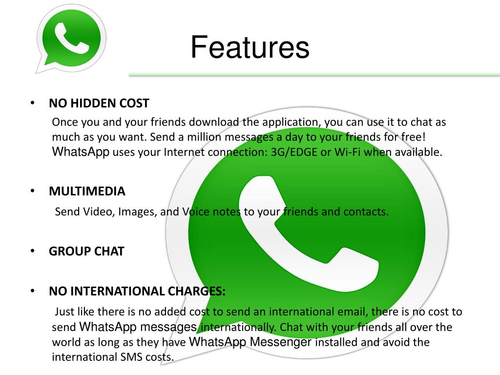 Features • NO HIDDEN COST Once you and your friends download the application, you can use it to chat as much as you want. Send a million messages a day to your friends for free! WhatsApp uses your Internet connection: 3G/EDGE or Wi-Fi when available. • MULTIMEDIA Send Video, Images, and Voice notes to your friends and contacts. • GROUP CHAT • NO INTERNATIONAL CHARGES: Just like there is no added cost to send an international email, there is no cost to send WhatsApp messages internationally. Chat with your friends all over the world as long as they have WhatsApp Messenger installed and avoid the international SMS costs.