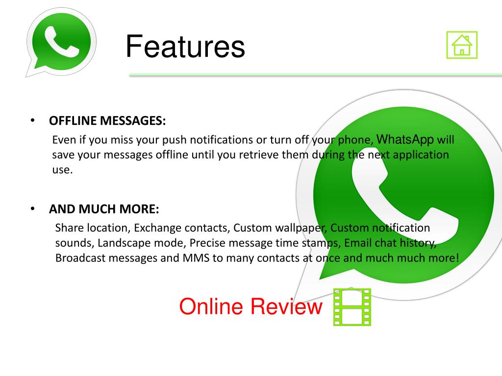 Features • OFFLINE MESSAGES: Even if you miss your push notifications or turn off your phone, WhatsApp will save your messages offline until you retrieve them during the next application use. • AND MUCH MORE: Share location, Exchange contacts, Custom wallpaper, Custom notification sounds, Landscape mode, Precise message time stamps, Email chat history, Broadcast messages and MMS to many contacts at once and much much more! Online Review