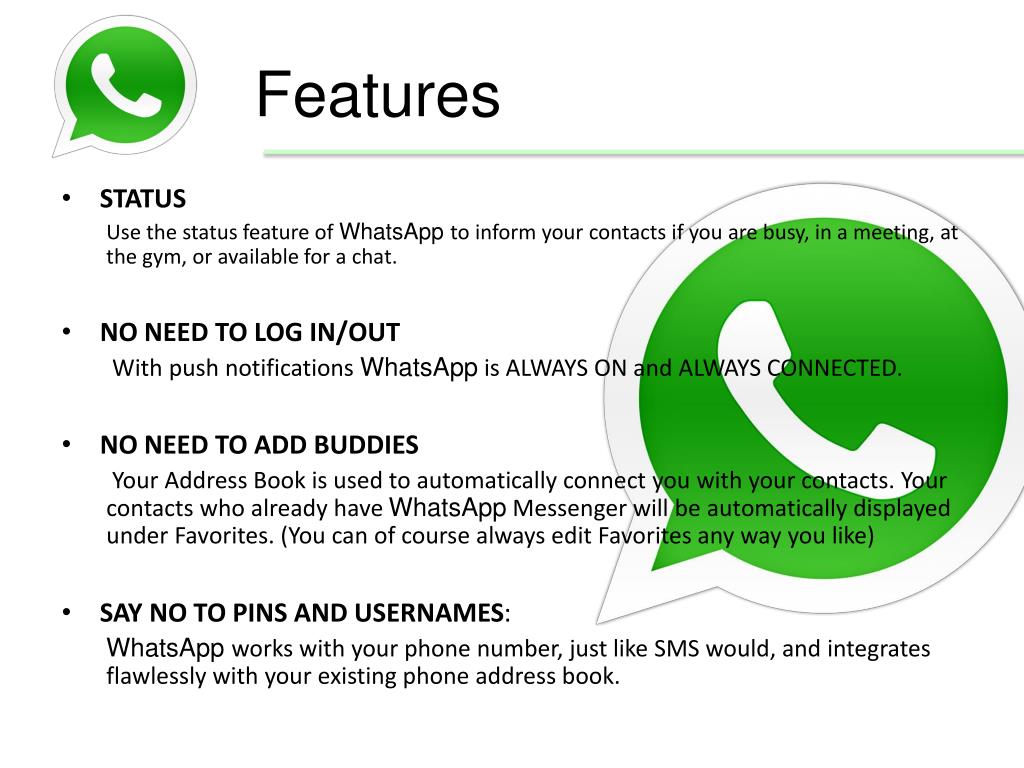 Features • STATUS Use the status feature of WhatsApp to inform your contacts if you are busy, in a meeting, at the gym, or available for a chat. • NO NEED TO LOG IN/OUT With push notifications WhatsApp is ALWAYS ON and ALWAYS CONNECTED. • NO NEED TO ADD BUDDIES Your Address Book is used to automatically connect you with your contacts. Your contacts who already have WhatsApp Messenger will be automatically displayed under Favorites. (You can of course always edit Favorites any way you like) • SAY NO TO PINS AND USERNAMES: WhatsApp works with your phone number, just like SMS would, and integrates flawlessly with your existing phone address book.