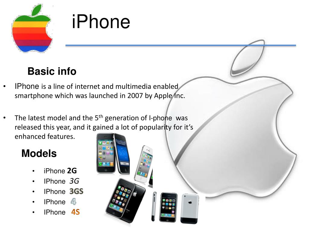 iPhone Basic info Models iPhone 2G IPhone 3G IPhone 3GS IPhone 4 IPhone 4S • IPhone is a line of internet and multimedia enabled smartphone which was launched in 2007 by Apple Inc. • The latest model and the 5th generation of I-phone was released this year, and it gained a lot of popularity for it’s enhanced features.