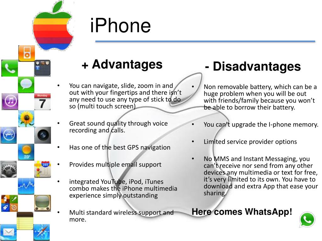 iPhone + Advantages - Disadvantages Non removable battery, which can be a huge problem when you will be out with friends/family because you won’t be able to borrow their battery. You can’t upgrade the I-phone memory. Limited service provider options No MMS and Instant Messaging, you can’t receive nor send from any other devices any multimedia or text for free, it’s very limited to its own. You have to download and extra App that ease your sharing. Here comes WhatsApp! • You can navigate, slide, zoom in and out with your fingertips and there isn’t any need to use any type of stick to do so (multi touch screen) • Great sound quality through voice recording and calls. • Has one of the best GPS navigation • Provides multiple email support • integrated YouTube, iPod, iTunes combo makes the iPhone multimedia experience simply outstanding • Multi standard wireless support and more.