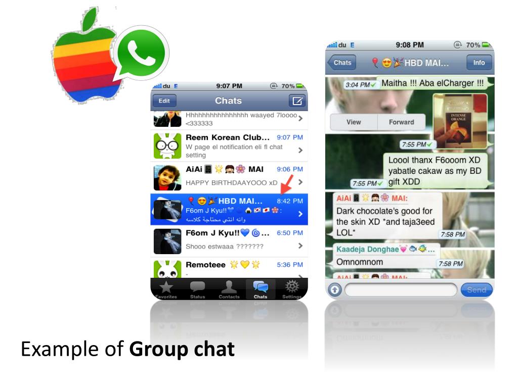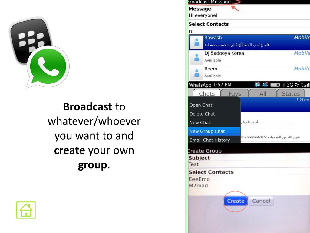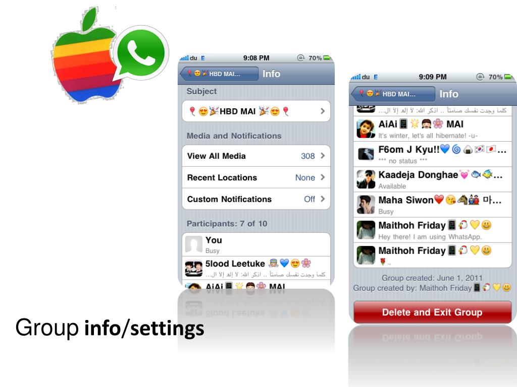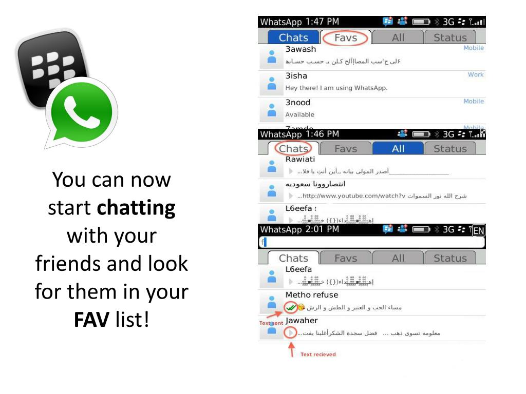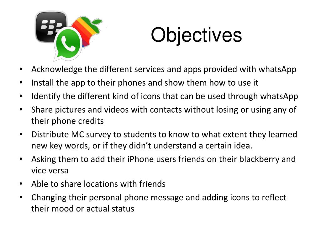 Objectives • Acknowledge the different services and apps provided with whatsApp • Install the app to their phones and show them how to use it • Identify the different kind of icons that can be used through whatsApp • Share pictures and videos with contacts without losing or using any of their phone credits • Distribute MC survey to students to know to what extent they learned new key words, or if they didn’t understand a certain idea. • Asking them to add their iPhone users friends on their blackberry and vice versa • Able to share locations with friends • Changing their personal phone message and adding icons to reflect their mood or actual status