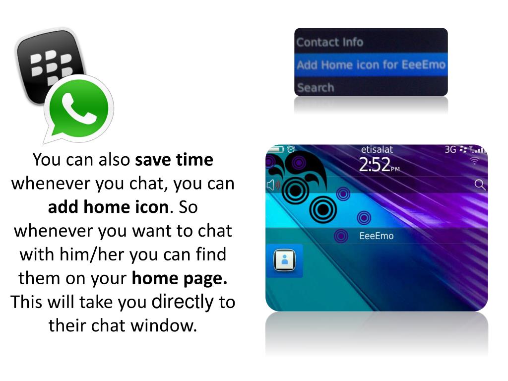 You can also save time whenever you chat, you can add home icon. So whenever you want to chat with him/her you can find them on your home page. This will take you directly to their chat window.