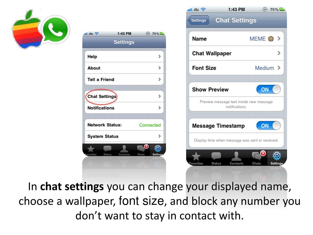 In chat settings you can change your displayed name, choose a wallpaper, font size, and block any number you don’t want to stay in contact with.