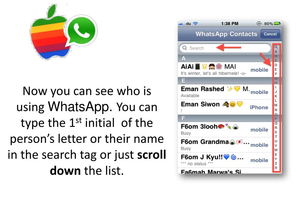 Now you can see who is using WhatsApp. You can type the 1st initial of the person’s letter or their name in the search tag or just scroll down the list.