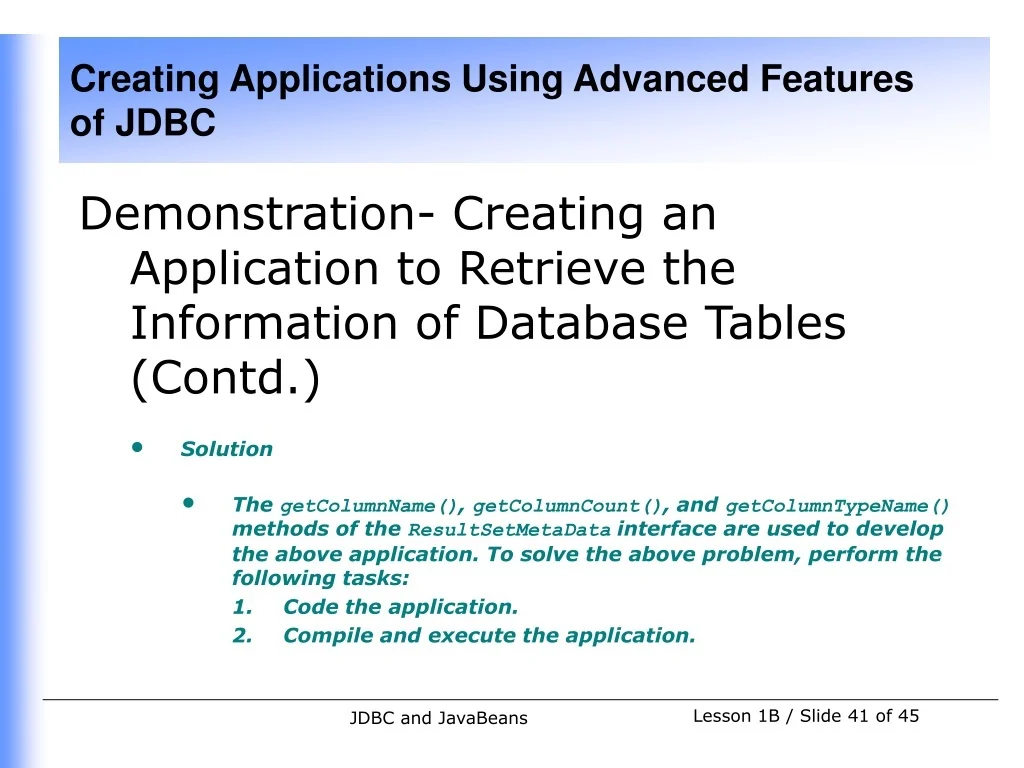 Demonstration- Creating an Application to Retrieve the Information of Database Tables (Contd.) • Solution • The getColumnName(), getColumnCount(), and getColumnTypeName() methods of the ResultSetMetaData interface are used to develop the above application. To solve the above problem, perform the following tasks: • Code the application. • Compile and execute the application. JDBC and JavaBeans