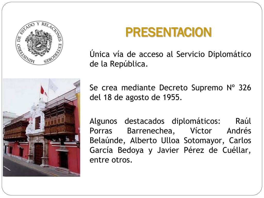Única vía de acceso al Servicio Diplomático de la República. Se crea mediante Decreto Supremo Nº 326 del 18 de agosto de 1955. Algunos destacados diplomáticos: Raúl Porras Barrenechea, Víctor Andrés Belaúnde, Alberto Ulloa Sotomayor, Carlos García Bedoya y Javier Pérez de Cuéllar, entre otros. PRESENTACION
