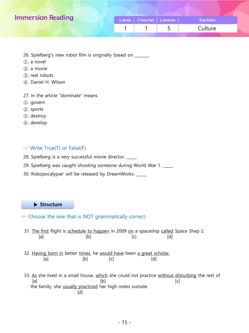 1 1 5 Culture ☞ Write True(T) or False(F). ▶ Structure ☞ Choose the one that is NOT grammatically correct. 31. The first flight is schedule to happen in 2009 on a spaceship called Space Shep 2. [a] [b] [c] [d] 32. Having born in better times, he would have been a great scholar. [a] [b] [c] [d] 33. As she lived in a small house, which she could not practice without disturbing the rest of [a] [b] [c] the family, she usually practiced her high notes outside. [d] - 15 -