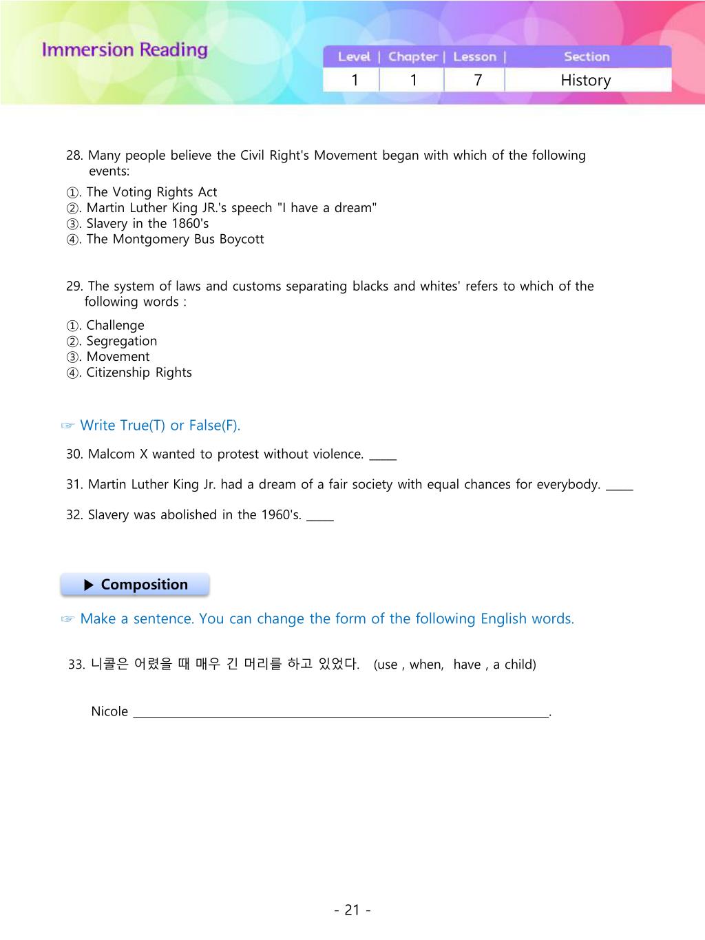 1 1 7 History ☞ Write True(T) or False(F). ▶ Composition ☞ Make a sentence. You can change the form of the following English words. 33. 니콜은 어렸을 때 매우 긴 머리를 하고 있었다. (use , when, have , a child) Nicole . - 21 -