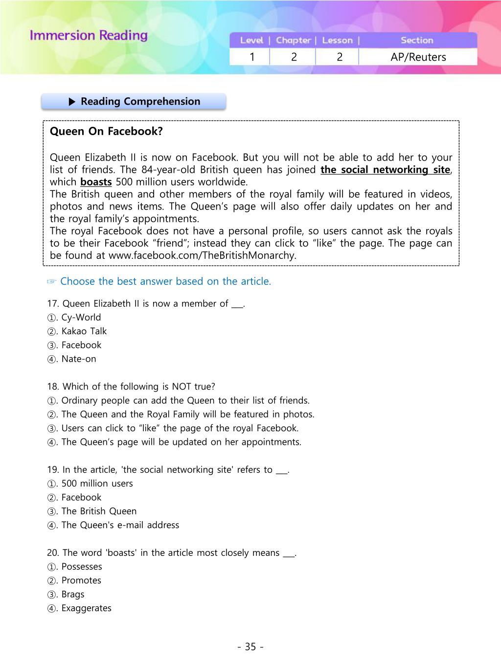 1 2 2 AP/Reuters ▶Reading Comprehension Queen On Facebook? Queen Elizabeth II is now on Facebook. But you will not be able to add her to your list of friends. The 84-year-old British queen has joined the social networking site, which boasts 500 million users worldwide. The British queen and other members of the royal family will be featured in videos, photos and news items. The Queen’s page will also offer daily updates on her and the royal family’s appointments. The royal Facebook does not have a personal profile, so users cannot ask the royals to be their Facebook “friend”; instead they can click to “like” the page. The page can be found at www.facebook.com/TheBritishMonarchy. ☞ Choose the best answer based on the article. - 35 -