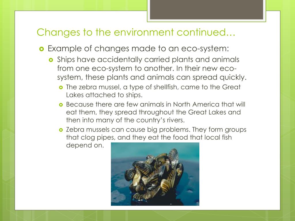 Changes to the environment continued… • Example of changes made to an eco-system: • Ships have accidentally carried plants and animals from one eco-system to another. In their new eco-system, these plants and animals can spread quickly. • The zebra mussel, a type of shellfish, came to the Great Lakes attached to ships. • Because there are few animals in North America that will eat them, they spread throughout the Great Lakes and then into many of the country’s rivers. • Zebra mussels can cause big problems. They form groups that clog pipes, and they eat the food that local fish depend on.