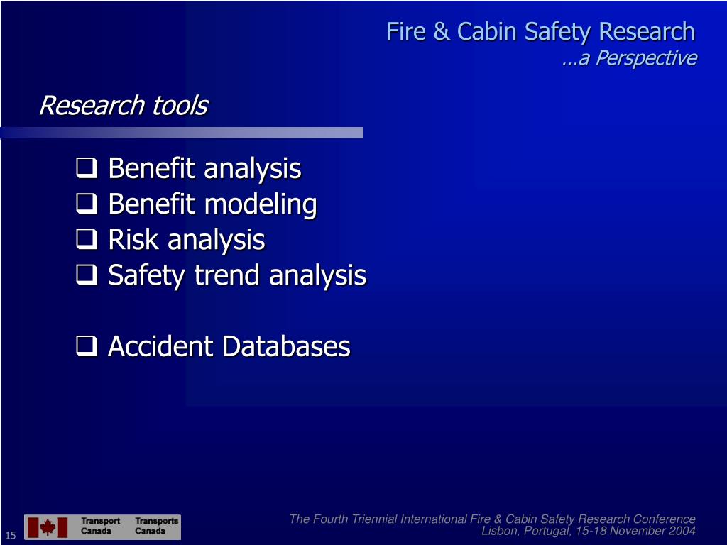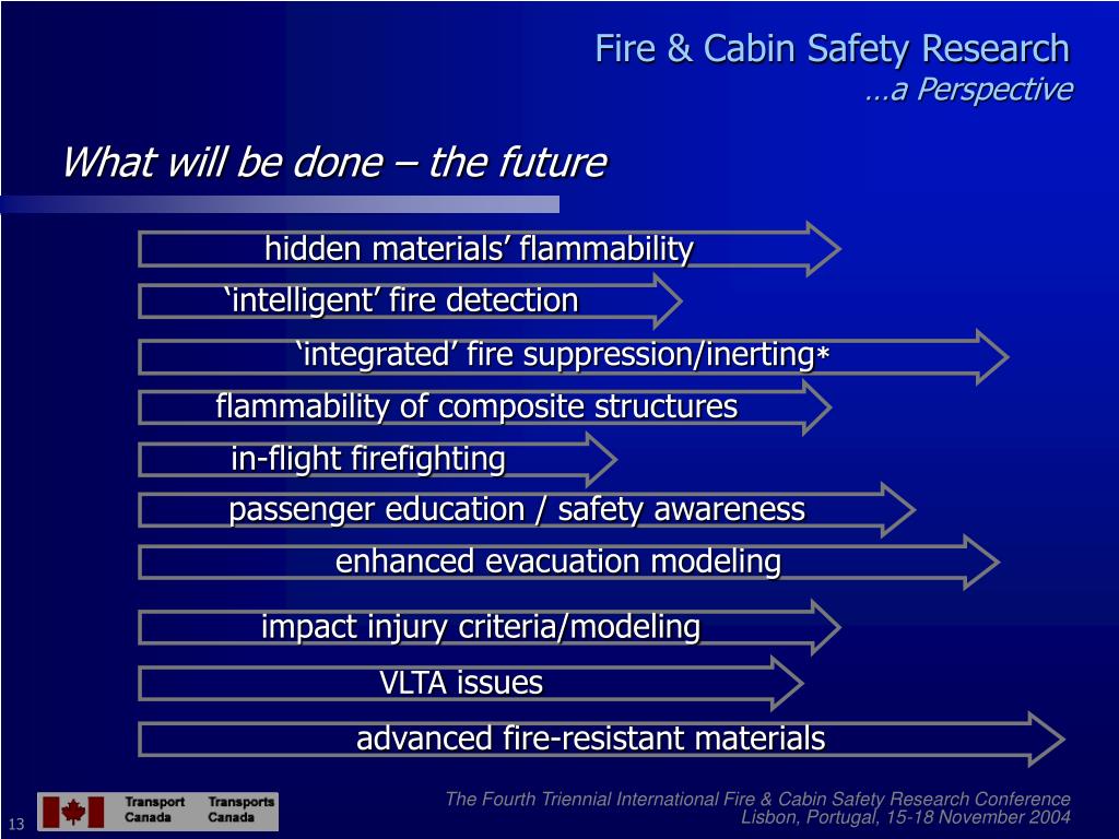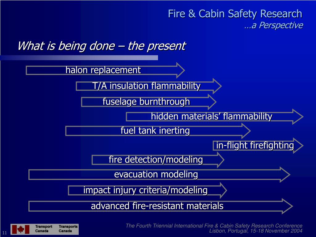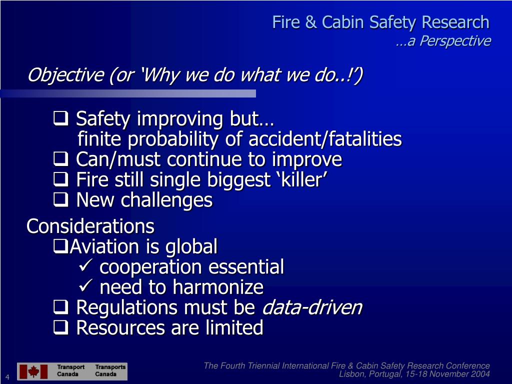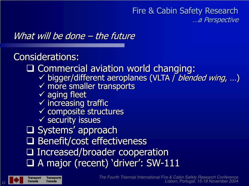 Fire and Cabin Safety Research … a Perspective. Maher Khouzam Chief, Regulatory Standards Aircraft Certification Transport Canada. The Fourth Triennial International Fire & Cabin Safety Research Conference Lisbon, Portugal, 15-18 November 2004. Fire & Cabin Safety Research …a Perspective.