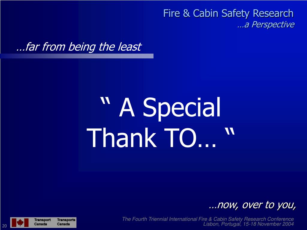 Fire & Cabin Safety Research…a Perspective “The greatest danger for most of us is not that our aim is too high and we miss it, but that it is too low and we reach it.” Michelangelo …and last, but far from being the least: The Fourth Triennial International Fire & Cabin Safety Research Conference Lisbon, Portugal, 15-18 November 2004 19