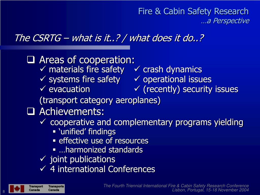 Fire & Cabin Safety Research…a Perspective The CSRTG – what is it..? / what does it do..? • Informal cooperation since early 80’s …triggered by Cincinnati/Manchester • Cabin Safety Research Technical Group (CSRTG) set up in 1994 by FAA, TCCA & JAA to integrate cooperative activities • Now includes 7 active ‘partners’: • Model for other international R&D groups The Fourth Triennial International Fire & Cabin Safety Research Conference Lisbon, Portugal, 15-18 November 2004 7