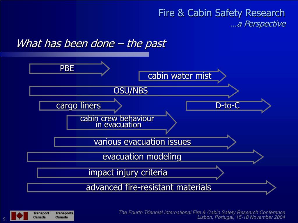Fire & Cabin Safety Research…a Perspective What has been done – the past PBE cabin water mist OSU/NBS cargo liners D-to-C cabin crew behaviour in evacuation various evacuation issues evacuation modeling impact injury criteria advanced fire-resistant materials The Fourth Triennial International Fire & Cabin Safety Research Conference Lisbon, Portugal, 15-18 November 2004 9