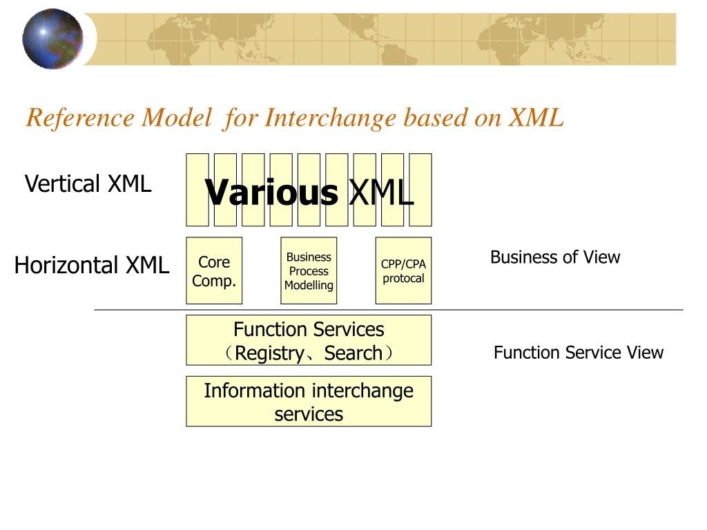 Reference Model for Interchange based on XML Vertical XML Various XML Core Comp. Business Process Modelling CPP/CPA protocal Business of View Horizontal XML Function Services (Registry、Search) Function Service View Information interchange services