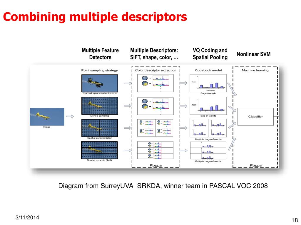 Combining multiple descriptors Multiple Feature Detectors Multiple Descriptors: SIFT, shape, color, … VQ Coding and Spatial Pooling Nonlinear SVM Diagram from SurreyUVA_SRKDA, winner team in PASCAL VOC 2008