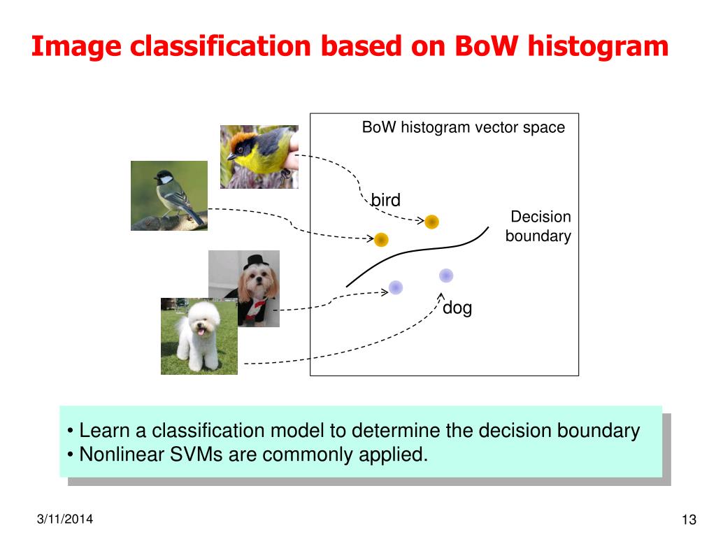Image classification based on BoW histogram BoW histogram vector space bird Decision boundary dog • Learn a classification model to determine the decision boundary • Nonlinear SVMs are commonly applied.