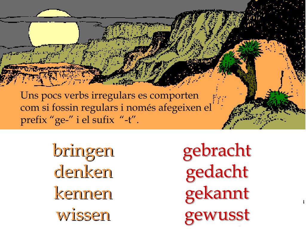Uns pocs verbs irregulars es comporten com si fossin regulars i només afegeixen el prefix “ge-” i el sufix “-t”. bringen denken kennen wissen gebracht gedacht gekannt gewusst