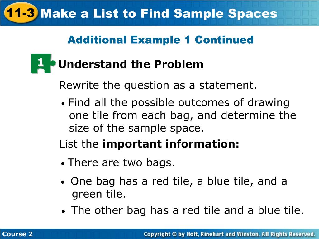 1 Understand the Problem Additional Example 1 Continued Rewrite the question as a statement. • Find all the possible outcomes of drawing one tile from each bag, and determine the size of the sample space. List the important information: • There are two bags. • One bag has a red tile, a blue tile, and a green tile. • The other bag has a red tile and a blue tile.