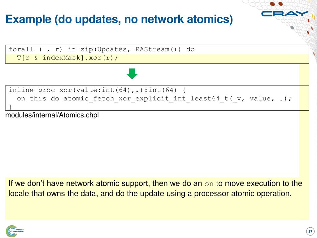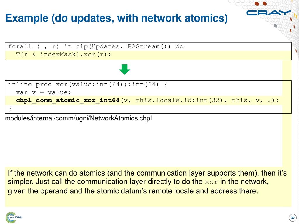 Example (do updates, with network atomics) forall (_, r) in zip(Updates, RAStream()) do T[r & indexMask].xor(r); inline procxor(value:int(64)):int(64) { var v = value; chpl_comm_atomic_xor_int64(v, this.locale.id:int(32), this._v, …); } modules/internal/comm/ugni/NetworkAtomics.chpl If the network can do atomics (and the communication layer supports them), then it’s simpler. Just call the communication layer directly to do the xor in the network, given the operand and the atomic datum’s remote locale and address there.