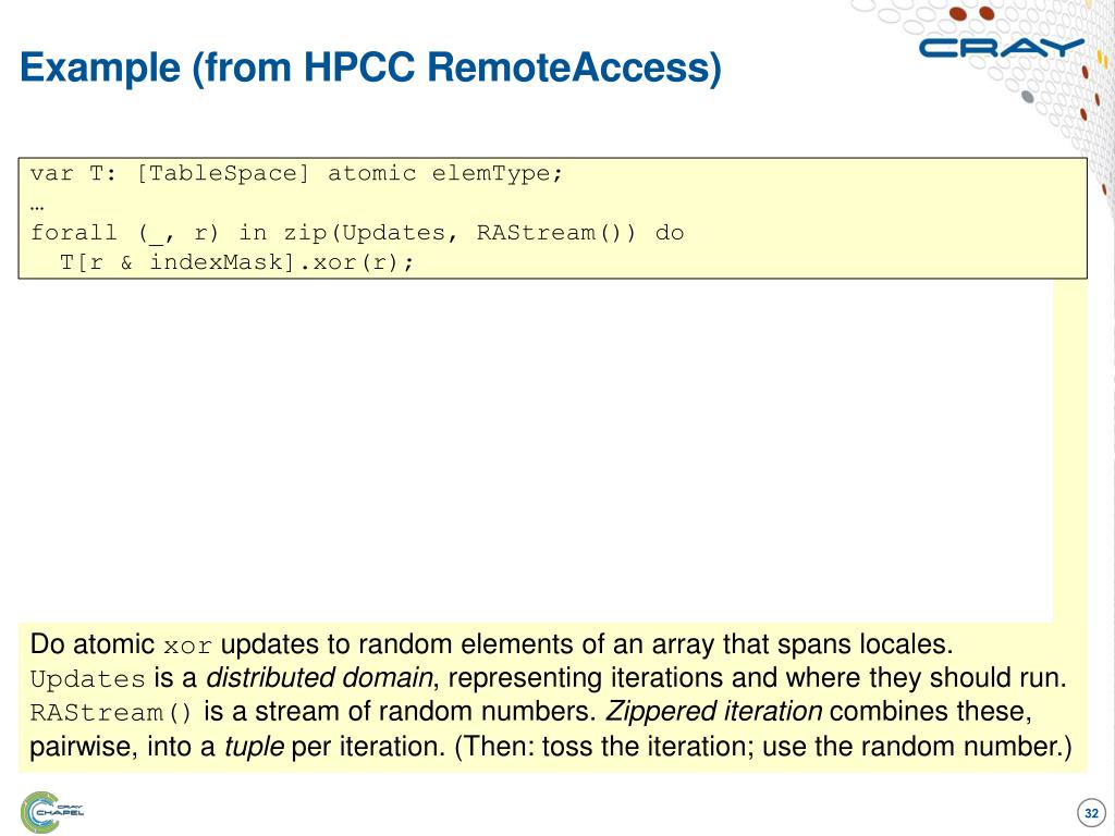 Example (from HPCC RemoteAccess) var T: [TableSpace] atomic elemType; … forall (_, r) in zip(Updates, RAStream()) do T[r & indexMask].xor(r); Do atomic xorupdates to random elements of an array that spans locales.Updatesis a distributed domain, representing iterations and where they should run. RAStream() is a stream of random numbers. Zippered iterationcombines these, pairwise, into a tupleper iteration. (Then: toss the iteration; use the random number.)
