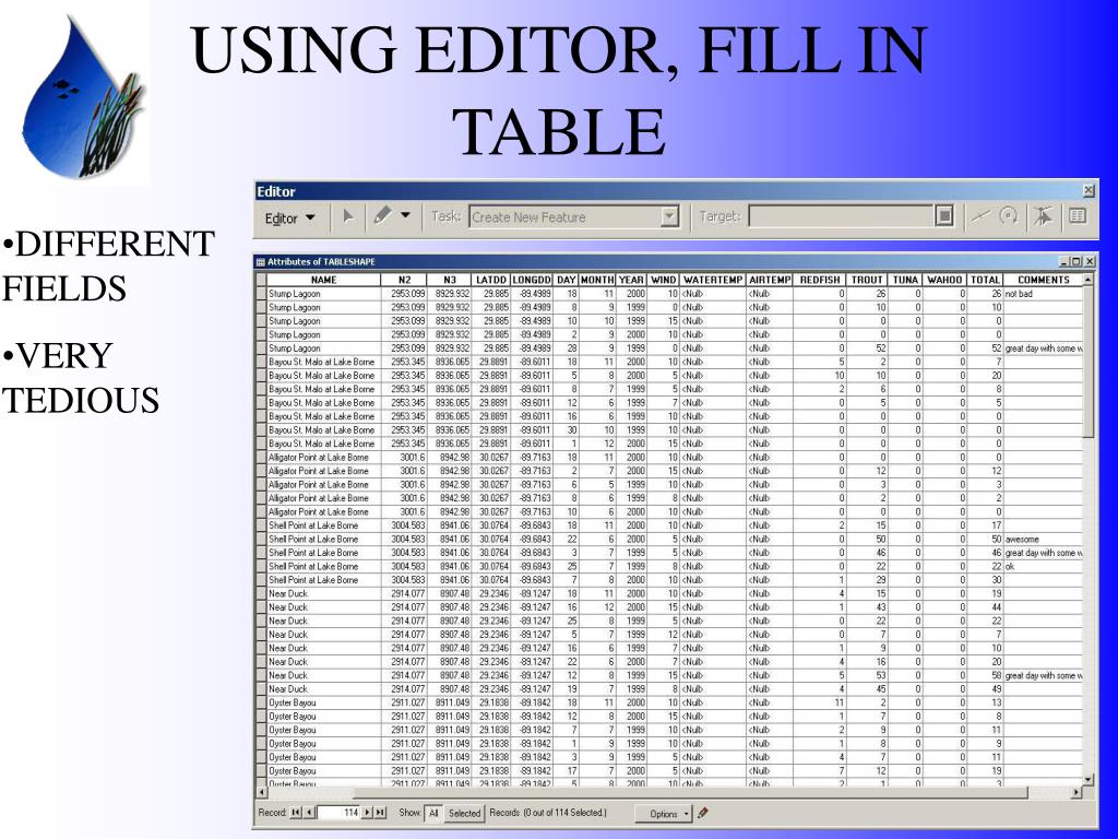 USING EDITOR, FILL IN TABLE • DIFFERENT FIELDS • VERY TEDIOUS