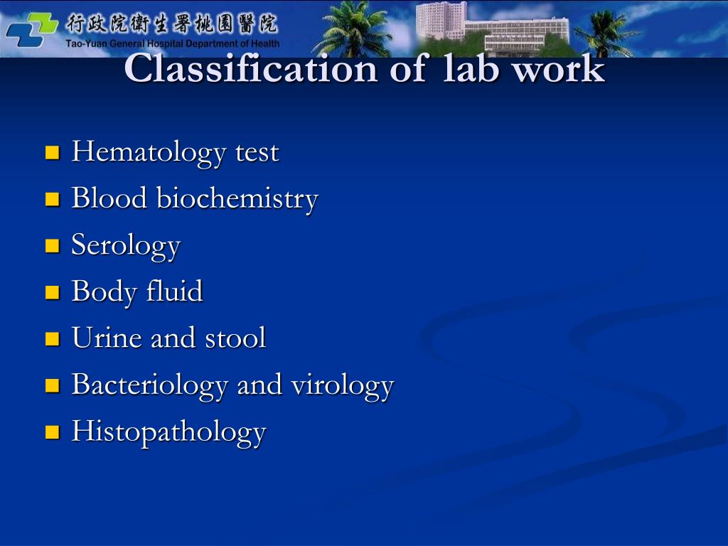 Classification of lab work • Hematology test • Blood biochemistry • Serology • Body fluid • Urine and stool • Bacteriology and virology • Histopathology