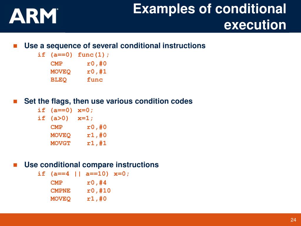 Examples of conditional execution Use a sequence of several conditional instructions if (a==0) func(1); CMP r0,#0MOVEQ r0,#1BLEQ func Set the flags, then use various condition codes if (a==0) x=0;if (a>0) x=1; CMP r0,#0MOVEQ r1,#0MOVGT r1,#1 Use conditional compare instructions if (a==4 || a==10) x=0; CMP r0,#4CMPNE r0,#10MOVEQ r1,#0