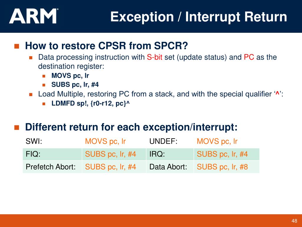 Exception / Interrupt Return • How to restore CPSR from SPCR? • Data processing instruction with S-bit set (update status) and PC as the destination register: • MOVS pc, lr • SUBS pc, lr, #4 • Load Multiple, restoring PC from a stack, and with the special qualifier ‘^’: • LDMFD sp!, {r0-r12, pc}^ • Different return for each exception/interrupt: