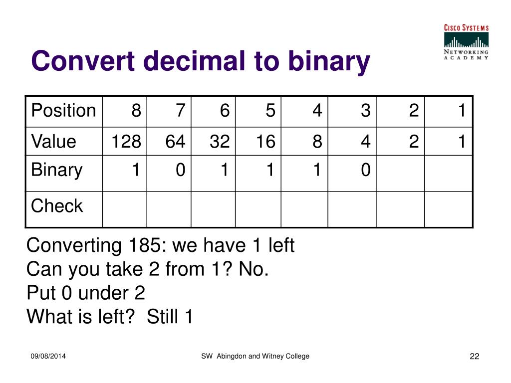Convert decimal to binary Convert 185 decimal to binary Can you take 128 from 185? Yes. Put 1 under 128 What is left? 185-128 = 57 SW Abingdon and Witney College