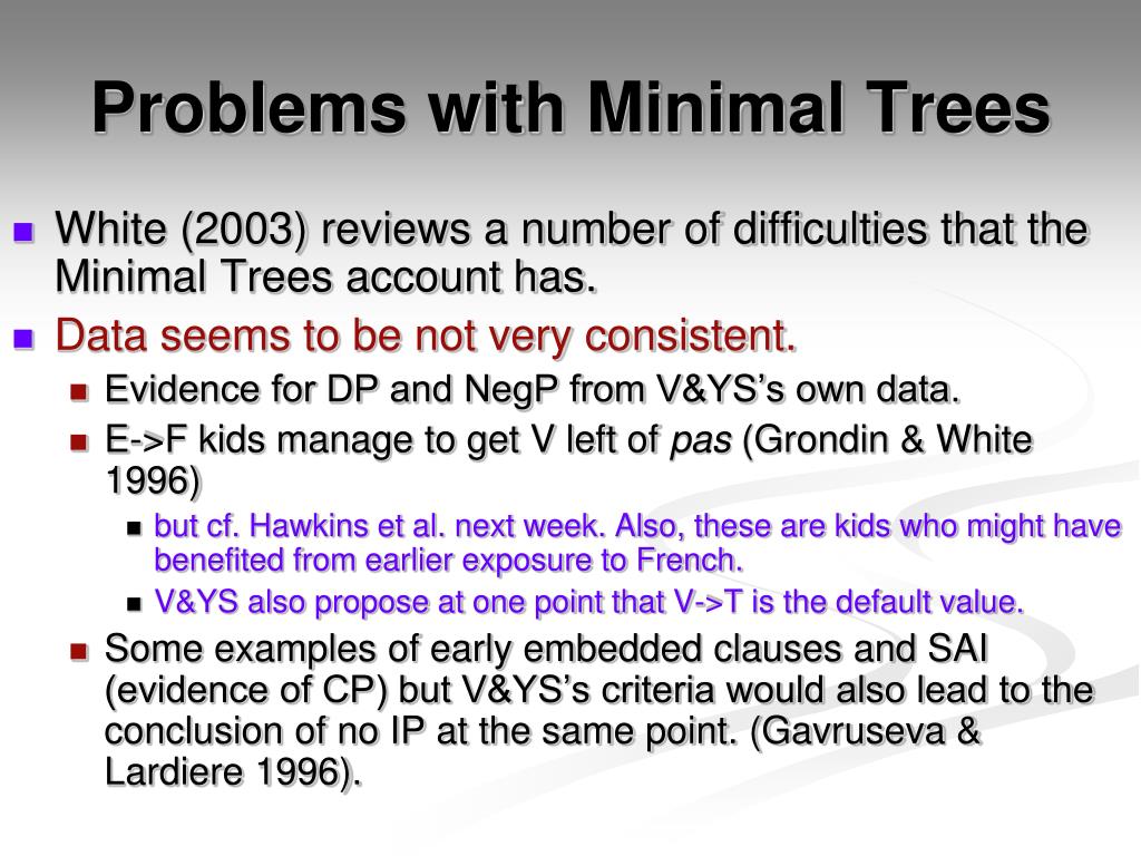 Problems with Minimal Trees • Criteria for stages are rather arbitrary. • V&YS count something as acquired if it appears more than 60% of the time. Why 60%? For kids, the arbitrary cutoff is often set at 90%. • Is morphology really the best indicator of knowledge? • Prévost & White, discussed a couple of weeks hence, say “no”— better is to look at the properties like word order that the functional categories are supposed to be responsible for. • To account for apparent V2 without CP, V&YS need a weird German story in which TP/AgrP starts out head-initial but is later returned to its proper head-final status.