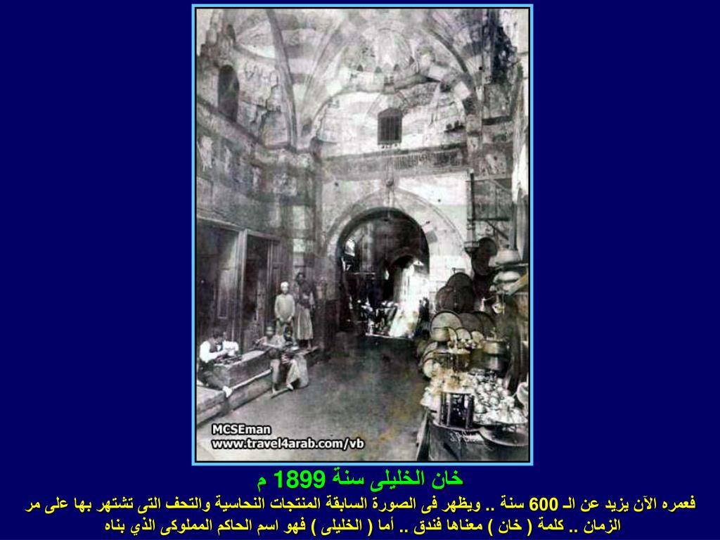 خان الخليلى سنة 1899 م فعمره الآن يزيد عن الـ 600 سنة .. ويظهر فى الصورة السابقة المنتجات النحاسية والتحف التى تشتهر بها على مر الزمان .. كلمة ( خان ) معناها فندق .. أما ( الخليلى ) فهو اسم الحاكم المملوكى الذي بناه