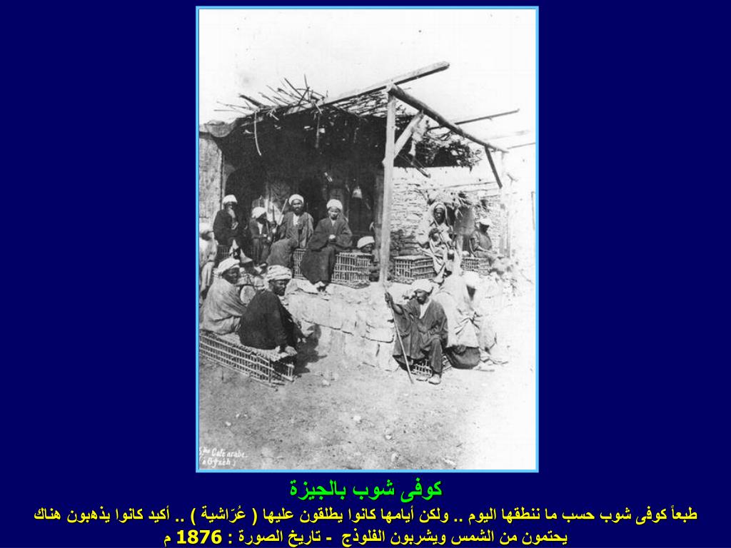 كوفى شوب بالجيزة طبعاً كوفى شوب حسب ما ننطقها اليوم .. ولكن أيامها كانوا يطلقون عليها ( عُرّاشية ) .. أكيد كانوا يذهبون هناك يحتمون من الشمس ويشربون الفلوذج - تاريخ الصورة : 1876 م