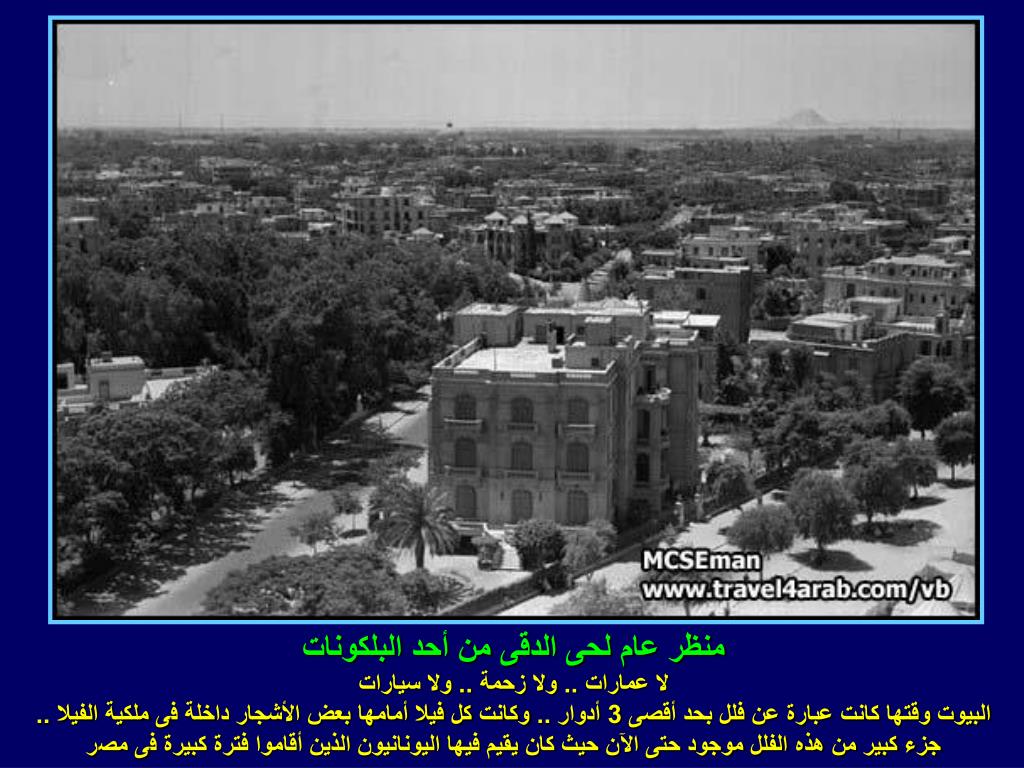 منظر عام لحى الدقى من أحد البلكونات لا عمارات .. ولا زحمة .. ولا سياراتالبيوت وقتها كانت عبارة عن فلل بحد أقصى 3 أدوار .. وكانت كل فيلا أمامها بعض الأشجار داخلة فى ملكية الفيلا .. جزء كبير من هذه الفلل موجود حتى الآن حيث كان يقيم فيها اليونانيون الذين أقاموا فترة كبيرة فى مصر