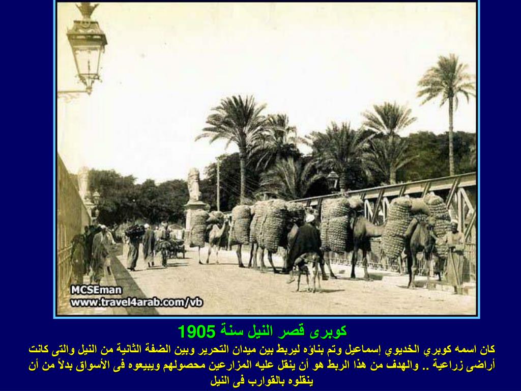كوبرى قصر النيل سنة 1905 كان اسمه كوبري الخديوي إسماعيل وتم بناؤه ليربط بين ميدان التحرير وبين الضفة الثانية من النيل والتى كانت أراضى زراعية .. والهدف من هذا الربط هو أن ينقل عليه المزارعين محصولهم ويبيعوه فى الأسواق بدلاً من أن ينقلوه بالقوارب فى النيل